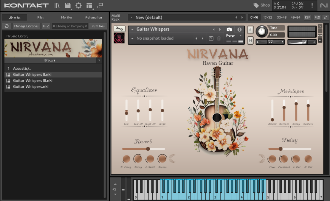 "Nirvana Guitar is a versatile Kontakt library featuring meticulously sampled acoustic and electric guitar tones. Designed for music producers and composers, it offers a wide range of dynamic, high-quality sounds. Whether you're crafting film scores, game music, or any musical genre, Nirvana Guitar delivers rich, authentic tones. Elevate your compositions with this focused guitar library."